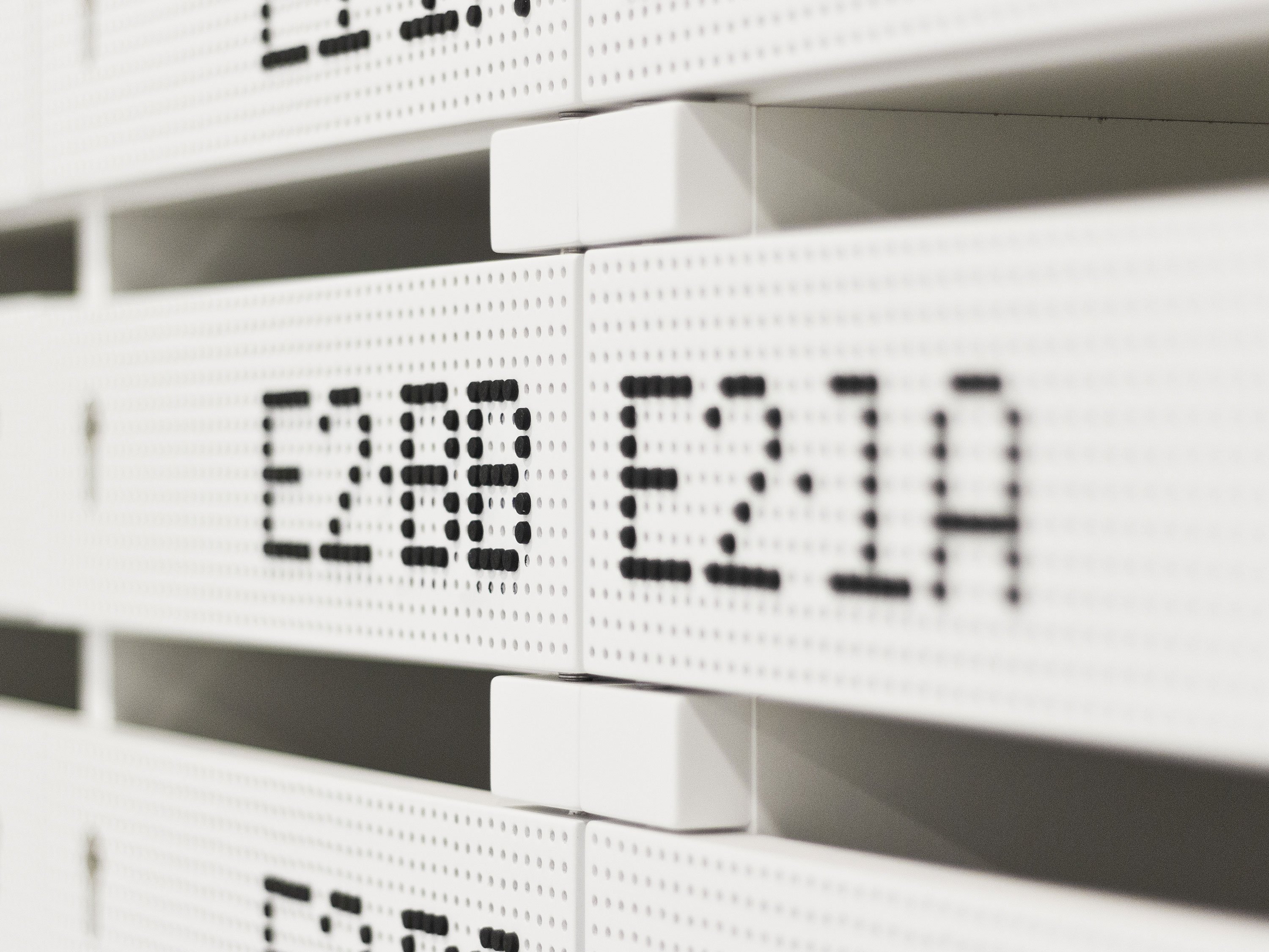 Tomando como referencia os panelados das zonas comúns, desenvolveuse unha tipografía e un conxunto de pictogramas definidos por puntos. O sistema gráfico comparte diámetro e separación entre puntos cas diferentes tramas dos panelados. Desta forma, destacando determinados puntos da trama podemos reproducir calquera dos grafismos que compoñen a linguaxe gráfica. Para este fin axudámonos de tapóns negros de goma, unha solución comercial, económica e de fácil instalación.