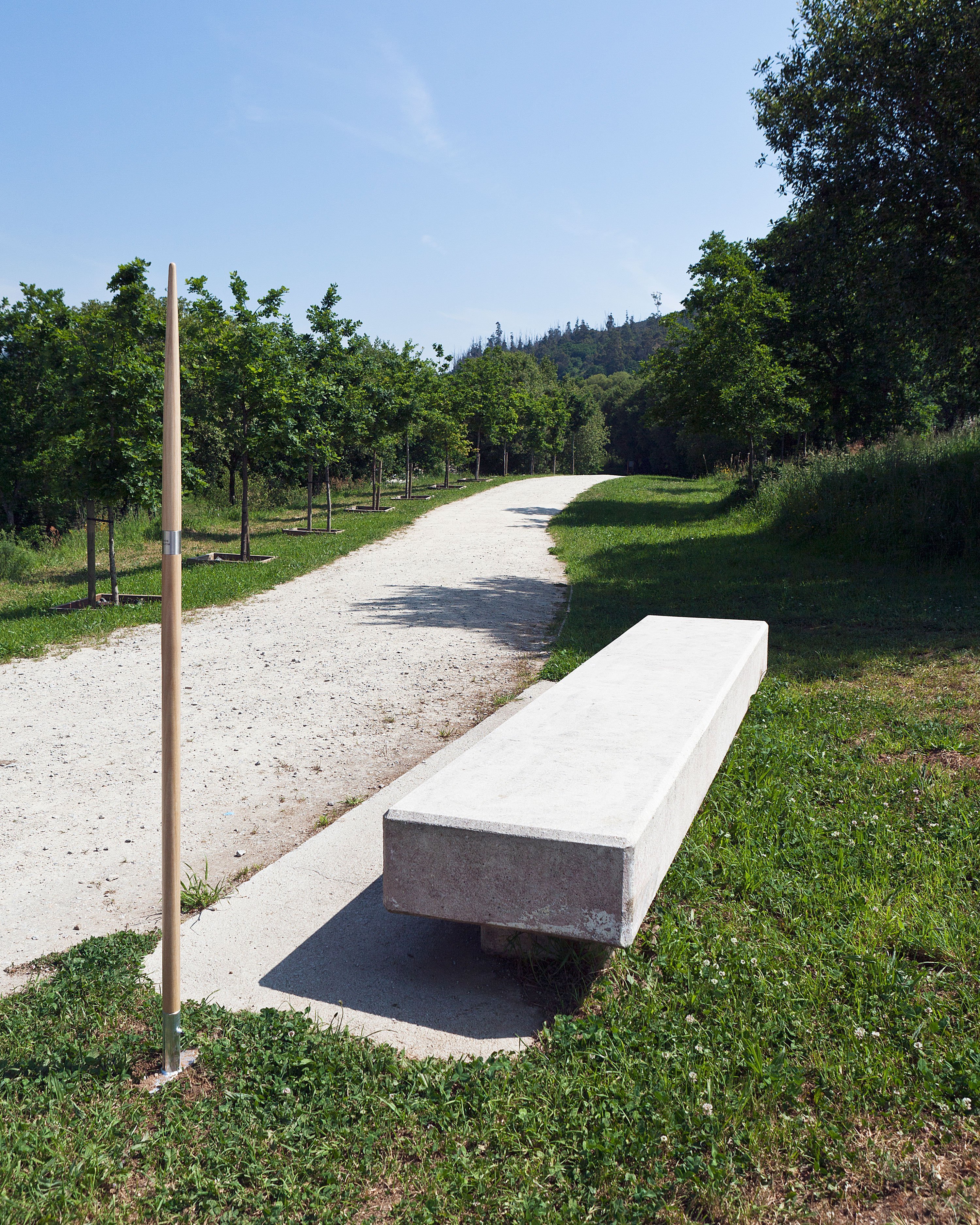 O sistema componse dunha serie de varas de madeira de diferente altura que se espetan no chan mediante unha punta metálica. Para proporcionar superficies de información empréganse ferramentas de traballo, nas que atopamos a perfecta unión entre un plano metálico inclinado e un cilindro vertical de madeira. Ademais desta cualidade mecánica, a descontextualización destes obxectos e o cambio de función permítennos establecer unha relación simbólica co uso anterior dos terreos que agora ocupa o museo.